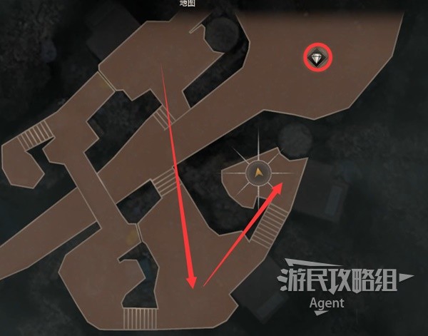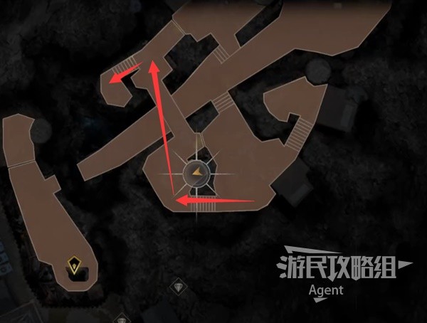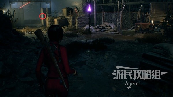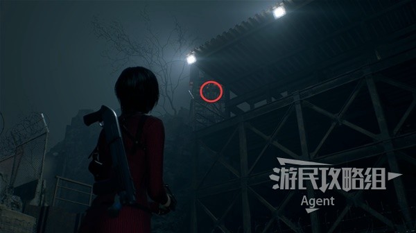 After changing the orientation of the second turret, the bridge that was just passed can no longer be reached. Look up at the tower at the marked position in the next picture and you will see an invisible bug. Then, follow the arrow direction and rush over to use the grappling hook for a leap.