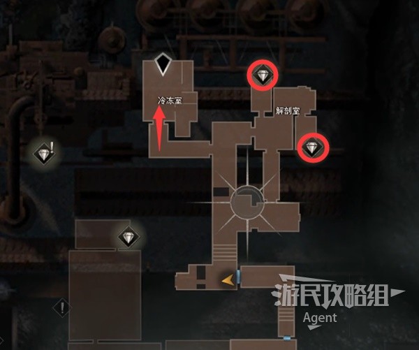 Walk up the stairs, pass the system room, go to the anatomy room (be careful as there might be regenerators), take two treasures from there, and then go to the freezer room.